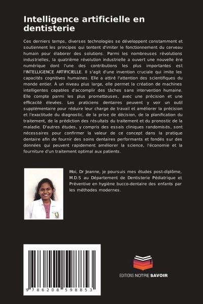 Ces derniers temps, diverses technologies se développent constamment et soutiennent les principes qui tentent d'imiter le fonctionnement du cerveau humain pour élaborer des solutions. Parmi les nombreuses révolutions industrielles, la quatrième révolution industrielle a ouvert une nouvelle ère numérique dont l'une des contributions les plus importantes est l'INTELLIGENCE ARTIFICIELLE. Il s'agit d'une invention cruciale qui imite les capacités cognitives humaines. Elle a attiré l'attention des scientifiques du monde entier. À un niveau plus large, elle permet la création de machines intelligentes capables d'accomplir des tâches sans intervention humaine. Elle compte parmi les plus prometteuses, avec une précision et une efficacité élevées. Les praticiens dentaires peuvent y voir un outil supplémentaire pour réduire leur charge de travail et améliorer la précision et l'exactitude du diagnostic, de la prise de décision, de la planification du traitement, de la prédiction des résultats du traitement et du pronostic de la maladie. D'autres études, y compris des essais cliniques randomisés, sont nécessaires pour confirmer la valeur de ce concept dans la pratique dentaire afin de fournir des soins dentaires performants et fondés sur des données qui peuvent rapidement améliorer la science, l'économie et la fourniture d'un traitement optimal aux patients.