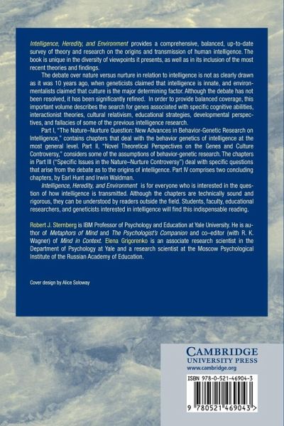 This book provides a comprehensive, balanced, up-to-date survey of theory and research on the origins and transmission of human intelligence. The book is unique in the diversity of viewpoints it presents, as well as in its inclusion of the most recent theories and findings.Intelligence, Heredity, and Environment is for everyone who is interested in the question of how intelligence is transmitted. Although the chapters are technically sound and rigorous, they can be understood by readers outside the field. Students, faculty, educational researchers, and geneticists interested in intelligence will find this indispensable reading.