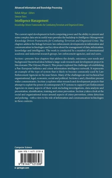 The current rapid development in both computing power and the ability to present and mine complex data sets in useful ways provides the backdrop to Intelligence Management: Knowledge Driven Frameworks for Combating Terrorism and Organized Crime. The chapters address the linkage between: law enforcement; developments in information and communication technologies and key ideas about the management of data, information, knowledge and intelligence. The work is conducted by a number of international academic and industrial research groups, law enforcement agencies, and end users.
