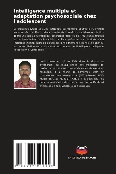 Le présent ouvrage est une caricature du mémoire soumis à l'Université Mahatma Gandhi, Kerala, dans le cadre de la maîtrise en éducation. Le titre donne une vue d'ensemble des différentes théories de l'intelligence multiple et de l'adaptation psychosociale. Le livre présente les résultats d'une recherche menée auprès d'élèves de l'enseignement secondaire supérieur sur la corrélation entre les sous-composantes de l'intelligence multiple et l'adaptation psychosociale.
