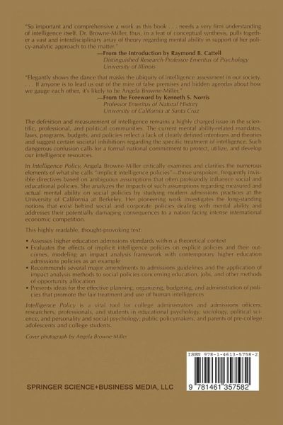 1. The Bell Tolls.- Specific Objectives.- Definitions and Structure.- I. The Demand for and Assessment of Mental Ability.- 2. The Supply of and Demand for Intelligence.- 3. The Juxtaposition of Individual and Institutional Assessment.- II. Mapping Social Policy Against a Theoretical Backdrop.- 4. Mapping Admissions and Other Social Policy against a Philosophical Backdrop.- 5. Academic Merit versus Fair Representation: A Case Study of the Undergraduate Admissions Policy at the University of California at Berkeley.- 6. Intelligence versus Higher Education as a Determinant of Worldly Success: The Sociopolitical Perspective.- 7. Academic Aptitude versus Achievement: Scientific Interpretations of Intelligence.- 8. Rationalist versus Empiricist Views: The Philosophical Backdrop on the Learnability of Intelligence.- 9. The Illusory Faces of Implicit Intelligence Policy.- III. The Impact of Implicit Intelligence Policy on Explicit Policy.- 10. The Potential Value of Impact Analysis on Intelligence Policy.- 11. The Impact of Implicit Intelligence Policy on Explicit University Admissions Policy.- 12. Recommendations and Conclusions: Toward a Coherent and Explicit Intelligence Policy.- 13. From Here to a Coherent and Explicit Intelligence Policy.- Appendixes.- A. Relevant Models of Impact Analysis.- B. Adaptation of Impact Analysis to Intelligence Policy Analysis.- C. Relevant Documents.- Notes.- About the Author.