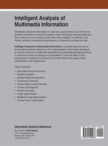 Multimedia represents information in novel and varied formats. One of the most prevalent examples of continuous media is video. Extracting underlying data from these videos can be an arduous task. From video indexing, surveillance, and mining, complex computational applications are required to process this data. Intelligent Analysis of Multimedia Information is a pivotal reference source for the latest scholarly research on the implementation of innovative techniques to a broad spectrum of multimedia applications by presenting emerging methods in continuous media processing and manipulation. This book offers a fresh perspective for students and researchers of information technology, media professionals, and programmers.