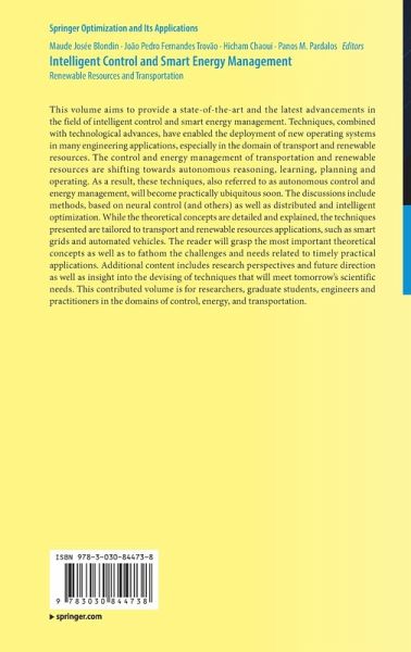 This volume aims to provide a state-of-the-art and the latest advancements in the field of intelligent control and smart energy management. Techniques, combined with technological advances, have enabled the deployment of new operating systems in many engineering applications, especially in the domain of transport and renewable resources. The control and energy management of transportation and renewable resources are shifting towards autonomous reasoning, learning, planning and operating. As a result, these techniques, also referred to as autonomous control and energy management, will become practically ubiquitous soon. The discussions include methods, based on neural control (and others) as well as distributed and intelligent optimization. While the theoretical concepts are detailed and explained, the techniques presented are tailored to transport and renewable resources applications, such as smart grids and automated vehicles. The reader will grasp the most important theoretical concepts as well as to fathom the challenges and needs related to timely practical applications. Additional content includes research perspectives and future direction as well as insight into the devising of techniques that will meet tomorrow's scientific needs. This contributed volume is for researchers, graduate students, engineers and practitioners in the domains of control, energy, and transportation.