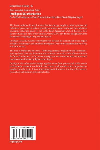 The book explains the need to decarbonise energy supplies, urban systems and industrial processes to reduce global greenhouse gases and meet the ambitious emissions reduction goals set out in the Paris Agreement 2016. It discusses how the introduction of AI to cyber-physical systems (CPS) can do this, using illustrations throughout to highlight the potential impacts. Intelligent Decarbonisation comprehensively assesses the current and future impact of digital technologies and artificial intelligence (AI) on the decarbonisation of key economic sectors. The book is divided into four parts - Technology, Impact, Implications and Incubation - moving clearly from the theoretical and technical to the real-world effects and areas for future development. It also presents insights into the economic and environmental transformation fostered by digital technologies. Intelligent Decarbonisation brings together work from private and public sector professionals, academics and think tank experts, and provides truly comprehensive insights into the topic. It is an interesting and informative text for policymakers, researchers and industry professionals alike.