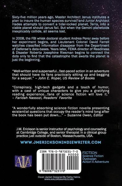 Sixty-five million years ago, Master Architect Janus institutes a plan to insure the human species survival, and Junior Architect Hades attempts to convert a tidal-locked planet, Terra, into a viable planet should Janus fail. But when the Gemini planetoids inexplicably collide, all seems lost. In 2008, the FBI whisk doctoral student Andrea Perez away before her experiment begins, and Lieutenant Colonel David Farrell watches classified information disappear from the Department of Defence's data-bases. Years later, FEMA director of Readiness & Disaster Roberta Josephine Riesman begins to connect…mehr