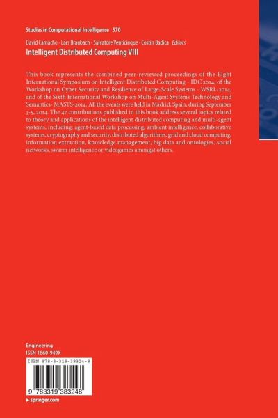 This book represents the combined peer-reviewed proceedings of the Eight International Symposium on Intelligent Distributed Computing - IDC'2014, of the Workshop on Cyber Security and Resilience of Large-Scale Systems - WSRL-2014, and of the Sixth International Workshop on Multi-Agent Systems Technology and Semantics- MASTS-2014. All the events were held in Madrid, Spain, during September 3-5, 2014. The 47 contributions published in this book address several topics related to theory and applications of the intelligent distributed computing and multi-agent systems, including: agent-based data processing, ambient intelligence, collaborative systems, cryptography and security, distributed algorithms, grid and cloud computing, information extraction, knowledge management, big data and ontologies, social networks, swarm intelligence or videogames amongst others.