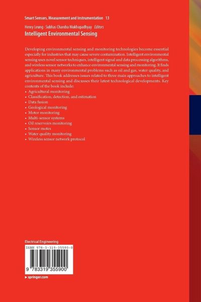 Developing environmental sensing and monitoring technologies become essential especially for industries that may cause severe contamination. Intelligent environmental sensing uses novel sensor techniques, intelligent signal and data processing algorithms, and wireless sensor networks to enhance environmental sensing and monitoring. It finds applications in many environmental problems such as oil and gas, water quality, and agriculture. This book addresses issues related to three main approaches to intelligent environmental sensing and discusses their latest technological developments. Key contents of the book include: