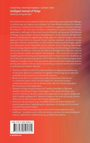 This holistic book is an invaluable reference for addressing various practical challenges in architecting and engineering Intelligent IoT and eHealth solutions for industry practitioners, academic and researchers, as well as for engineers involved in product development. The first part provides a comprehensive guide to fundamentals, applications, challenges, technical and economic benefits, and promises of the Internet of Things using examples of real-world applications. It also addresses all important aspects of designing and engineering cutting-edge IoT solutions using a cross-layer approach from device to fog, and cloud covering standards, protocols, design principles, reference architectures, as well as all the underlying technologies, pillars, and components such as embedded systems, network, cloud computing, data storage, data processing, big data analytics, machine learning, distributed ledger technologies, and security. In addition, it discusses the effects of Intelligent IoT, which are reflected in new business models and digital transformation. The second part provides an insightful guide to the design and deployment of IoT solutions for smart healthcare as one of the most important applications of IoT. Therefore, the second part targets smart healthcare-wearable sensors, body area sensors, advanced pervasive healthcare systems, and big data analytics that are aimed at providing connected health interventions to individuals for healthier lifestyles.