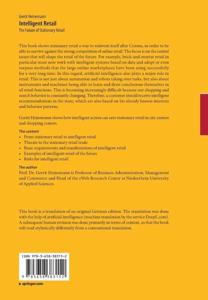 This book shows stationary retail a way to reinvent itself after Corona, in order to be able to survive against the strong competition of online retail. The focus is on the central issues that will shape the retail of the future. For example, brick-and-mortar retail in particular must now work with intelligent systems based on data and adopt or even surpass methods that the large online marketplaces have been using successfully for a very long time. In this regard, artificial intelligence also plays a major role in retail. This is not just about automation and robots taking over tasks, but also about instruments and machines being able to learn and draw conclusions themselves in all retail functions. This is becoming increasingly difficult because our shopping and search behavior is constantly changing. Therefore, a customer should receive intelligent recommendations in the store, which are also based on his already known interests and behavior patterns.