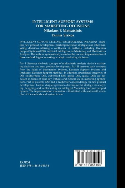 Part I discusses the basic concepts of multicriteria analysis vis-à-vis marketing decisions and in new product development situations. Part II presents basic concepts from the fields of Information Systems, Decision Support Systems, and Intelligent Decision Support Methods. In addition, specialized categories of DSS (multicriteria DSS, web-based DSS, group DSS, spatial DSS) are discussed in terms of their key features and current use in marketing applications. Part III presents IDSS and a multicriteria methodology for new product development. Further chapters present a developmental strategy for analyzing, designing, and implementing an Intelligent Marketing Decision Support System. The implementation discussion is illustrated with a real-world example of the methods and system in use.