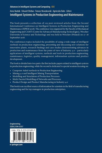 The book presents a collection of 103 peer-reviewed articles from the Second International Conference on Intelligent Systems in Production Engineering and Maintenance (ISPEM 2018). The conference was organized by the Faculty of Mechanical Engineering and CAMT (Centre for Advanced Manufacturing Technologies), Wroclaw University of Science and Technology and was held in Wroclaw (Poland) on 17-18 September 2018.