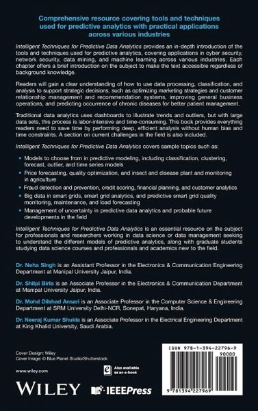 Comprehensive resource covering tools and techniques used for predictive analytics with practical applications across various industries Intelligent Techniques for Predictive Data Analytics provides an in-depth introduction of the tools and techniques used for predictive analytics, covering applications in cyber security, network security, data mining, and machine learning across various industries. Each chapter offers a brief introduction on the subject to make the text accessible regardless of background knowledge. Readers will gain a clear understanding of how to use data processing, classification, and analysis to support strategic decisions, such as optimizing marketing strategies and customer relationship management and recommendation systems, improving general business operations, and predicting occurrence of chronic diseases for better patient management. Traditional data analytics uses dashboards to illustrate trends and outliers, but with large data sets, this process is labor-intensive and time-consuming. This book provides everything readers need to save time by performing deep, efficient analysis without human bias and time constraints. A section on current challenges in the field is also included. Intelligent Techniques for Predictive Data Analytics covers sample topics such as: * Models to choose from in predictive modeling, including classification, clustering, forecast, outlier, and time series models * Price forecasting, quality optimization, and insect and disease plant and monitoring in agriculture * Fraud detection and prevention, credit scoring, financial planning, and customer analytics * Big data in smart grids, smart grid analytics, and predictive smart grid quality monitoring, maintenance, and load forecasting * Management of uncertainty in predictive data analytics and probable future developments in the field Intelligent Techniques for Predictive Data Analytics is an essential resource on the subject for professionals and researchers working in data science or data management seeking to understand the different models of predictive analytics, along with graduate students studying data science courses and professionals and academics new to the field.