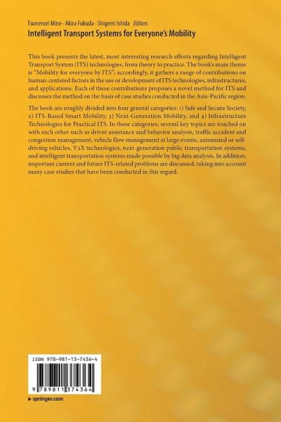 The book are roughly divided into four general categories: 1) Safe and Secure Society, 2) ITS-Based Smart Mobility, 3) Next-Generation Mobility, and 4) Infrastructure Technologies for Practical ITS. In these categories, several key topics are touched on with each other such as driver assistance and behavior analysis, traffic accident and congestion management, vehicle flow management at large events, automated or self-driving vehicles, V2X technologies, next-generation public transportation systems, and intelligent transportation systems made possible by big data analysis. In addition, important current and future ITS-related problems are discussed, taking into account many case studies that have been conducted in this regard.