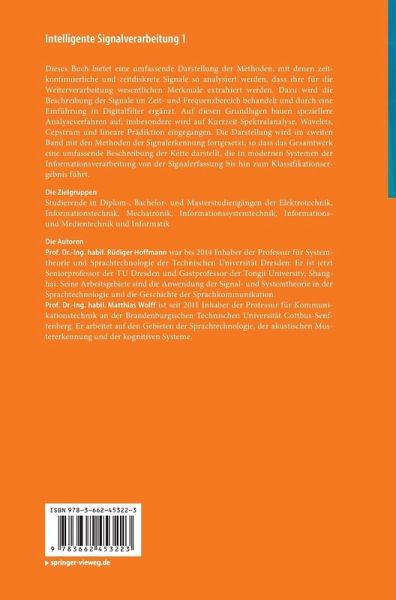 Dieses Buch bietet eine umfassende Darstellung der Methoden, mit denen zeitkontinuierliche und zeitdiskrete Signale so analysiert werden, dass ihre für die Weiterverarbeitung wesentlichen Merkmale extrahiert werden. Dazu wird die Beschreibung der Signale im Zeit- und Frequenzbereich behandelt und durch eine Einführung in Digitalfilter ergänzt. Auf diesen Grundlagen bauen speziellere Analyseverfahren auf; insbesondere wird auf Kurzzeit-Spektralanalyse, Wavelets, Cepstrum und lineare Prädiktion eingegangen. Die Darstellung wird im zweiten Band mit den Methoden der Signalerkennung fortgesetzt, so dass das Gesamtwerk eine umfassende Beschreibung der Kette darstellt, die in modernen Systemen der Informationsverarbeitung von der Signalerfassung bis hin zum Klassifikationsergebnis führt.