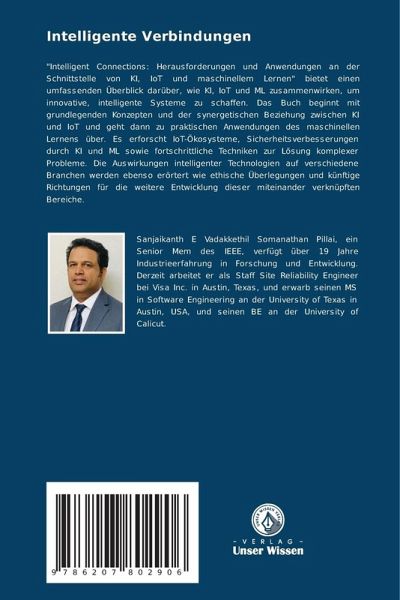 "Intelligent Connections: Herausforderungen und Anwendungen an der Schnittstelle von KI, IoT und maschinellem Lernen" bietet einen umfassenden Überblick darüber, wie KI, IoT und ML zusammenwirken, um innovative, intelligente Systeme zu schaffen. Das Buch beginnt mit grundlegenden Konzepten und der synergetischen Beziehung zwischen KI und IoT und geht dann zu praktischen Anwendungen des maschinellen Lernens über. Es erforscht IoT-Ökosysteme, Sicherheitsverbesserungen durch KI und ML sowie fortschrittliche Techniken zur Lösung komplexer Probleme. Die Auswirkungen intelligenter Technologien auf verschiedene Branchen werden ebenso erörtert wie ethische Überlegungen und künftige Richtungen für die weitere Entwicklung dieser miteinander verknüpften Bereiche.