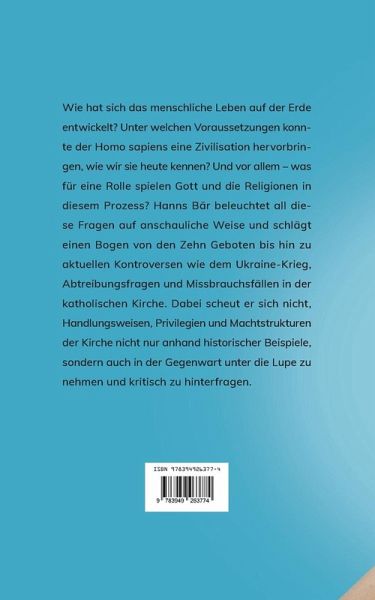 Wie hat sich das menschliche Leben auf der Erde entwickelt? Unter welchen Voraussetzungen konnte der Homo sapiens eine Zivilisation hervorbringen, wie wir sie heute kennen? Und vor allem - was für eine Rolle spielen Gott und die Religionen in diesem Prozess? Hanns Bär beleuchtet all diese Fragen auf anschauliche Weise und schlägt einen Bogen von den Zehn Geboten bis hin zu aktuellen Kontroversen wie dem Ukraine-Krieg, Abtreibungsfragen und Missbrauchsfällen in der katholischen Kirche. Dabei scheut er sich nicht, Handlungsweisen, Privilegien und Machtstrukturen der Kirche nicht nur anhand historischer Beispiele, sondern auch in der Gegenwart unter die Lupe zu nehmen und kritisch zu hinterfragen.