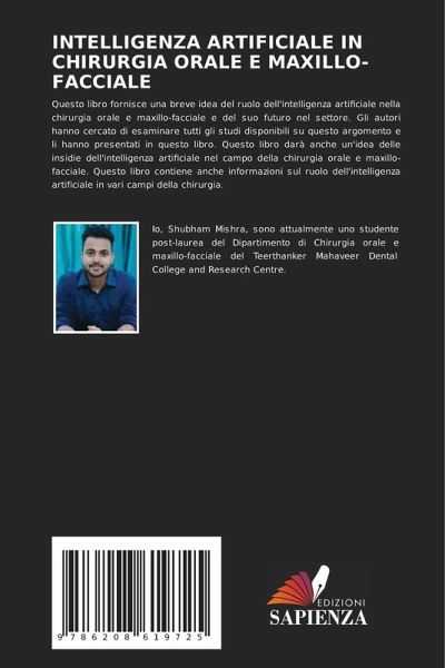 Questo libro fornisce una breve idea del ruolo dell'intelligenza artificiale nella chirurgia orale e maxillo-facciale e del suo futuro nel settore. Gli autori hanno cercato di esaminare tutti gli studi disponibili su questo argomento e li hanno presentati in questo libro. Questo libro darà anche un'idea delle insidie dell'intelligenza artificiale nel campo della chirurgia orale e maxillo-facciale. Questo libro contiene anche informazioni sul ruolo dell'intelligenza artificiale in vari campi della chirurgia.