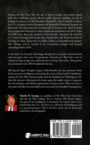 During the Viet Nam War the use of Agent Orange, riot control agents and other herbicides greatly affected public opinion regarding the use of biological weapons. In 1969 President Richard M. Nixon ordered an end to the U.S. biological research program and directed all biological weapons be destroyed. Not destroyed were several strains of Coronavirus which had not been weaponized. Research on these viruses was continued until 2019, when the CDC shut down the research at Fort Detrick, Maryland. By then the U.S. viral technology had already been transferred to the Wuhan Institute of Virology in China, along with 3.6 million dollars to fund additional research. The Chinese were in control of the Coronavirus samples and research technology before 2019. In the early 21st Century technology changed the way people communicated and were given their news. Corporations, referred to as "Big Tech," were in control of what people were told and what was kept from them. Their power was exercised in the 2020 Presidential election. FBI Special Agent Douglas Gregory finds himself cast into positions where he has access to intelligence concerning the cause of the Covid-19 pandemic, reasons for the 2020 election results and the lockdown of Washington, DC after the election. Information he learns gives the reader reason to question the Government and Media explanations of these events. What we learn is the cause and effect of controlled events can result in Intended Consequences. Charles D. George, is a graduate of The Ohio State University and the Air War College. He is a former Special Agent of the FBI, was associated with the Intelligence Community for twenty two years, is a retired U.S. Air Force Director of Intelligence and is a practicing lawyer.