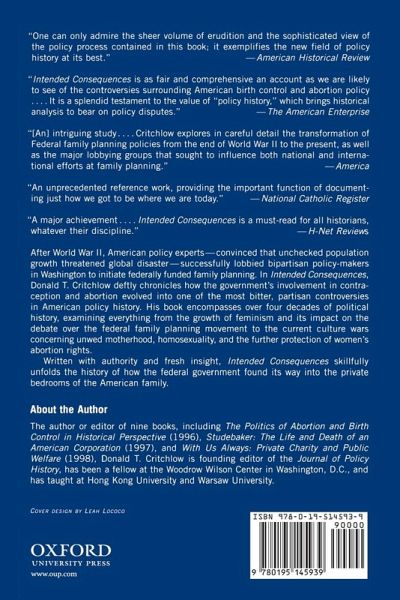 After World War II, U.S. policy experts--convinced that unchecked population growth threatened global disaster--successfully lobbied bipartisan policy-makers in Washington to initiate federally-funded family planning. In Intended Consequences, Donald T. Critchlow deftly chronicles how the government's involvement in contraception and abortion evolved into one of the most bitter, partisan controversies in American political history. The growth of the feminist movement in the late 1960s fundamentally altered the debate over the federal family planning movement, shifting its focus from population control directed by established interests in the philanthropic community to highly polarized pro-abortion and anti-abortion groups mobilized at the grass-roots level. And when the Supreme Court granted women the Constitutional right to legal abortion in 1973, what began as a bi-partisan, quiet revolution during the administrations of Kennedy and Johnson exploded into a contentious argument over sexuality, welfare, the role of women, and the breakdown of traditional family values. Intended Consequences encompasses over four decades of political history, examining everything from the aftermath of the Republican "moral revolution" during the Reagan and Bush years to the current culture wars concerning unwed motherhood, homosexuality, and the further protection of women's abortion rights. Critchlow's carefully balanced appraisal of federal birth control and abortion policy reveals that despite the controversy, the family planning movement has indeed accomplished much in the way of its intended goal--the reduction of population growth in many parts of the world. Written withauthority, fresh insight, and impeccable research, Intended Consequences skillfully unfolds the history of how the federal government found its way into the private bedrooms of the American family.
