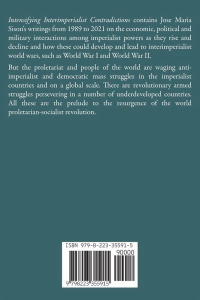 Intensifying Interimperialist Contradictions contains Jose Maria Sison's writings from 1989 to 2021 on the economic, political and military interactions among imperialist powers as they rise and decline and how these could develop and lead to interimperialist world wars, such as World War I and World War II. But the proletariat and people of the world are waging anti-imperialist and democratic mass struggles in the imperialist countries and on a global scale. There are revolutionary armed struggles persevering in a number of underdeveloped countries. All these are the prelude to the resurgence of the world proletarian-socialist revolution.