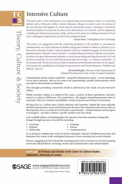 Contemporary culture, today's capitalism - our global information society - is ever expanding, is ever more extensive. And yet we seem to be experiencing a parallel phenomenon which can only be characterised as intensive. This thought provoking, innovative book is dedicated to the study of such intensive culture. Whilst extensive culture is a culture of the same: a culture of fixed equivalence; intensive culture is a culture of difference, of in-equivalence - the singular. Intensities generate what we encounter. They are virtuals or possibilities, always in process and always in movement. We thus live in a culture that is both extensive and intensive. Indeed the more globally stretched and extensive social relations become the more they simultaneously seem to take on this intensity. Ours is a relational world where each intensity ? whether human, technological or biological ? provides a distinct, specific window onto the whole. Lash tracks the emergence and pervasion of this intensive culture in society, religion, philosophy, language, communications, politics and the neo-liberal economy itself. In so doing he redefines the work of Leibniz, Benjamin, Simmel, and Durkheim and inititates the reader into the ontological structures of our contemporary social relations. In the pursuit of intensive culture the reader is taken on an excursion from Karl Marx's Capital to the 'information theology' in the science fiction of Philip K. Dick. Diverse, engaging and rich in detail the resulting book will be of interest to all those studying social and cultural theory, sociology, media and communication and cultural studies