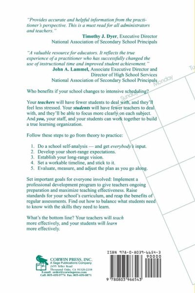 Intensive scheduling or block scheduling has become a controversial educational reform initiative in the United States. This book centres on the difficult questions that surface about intensive scheduling and addresses important concerns and common successes. Unlike other books that cover this topic from a theoretical standpoint, the book provides a blueprint from a practitioner's perspective.