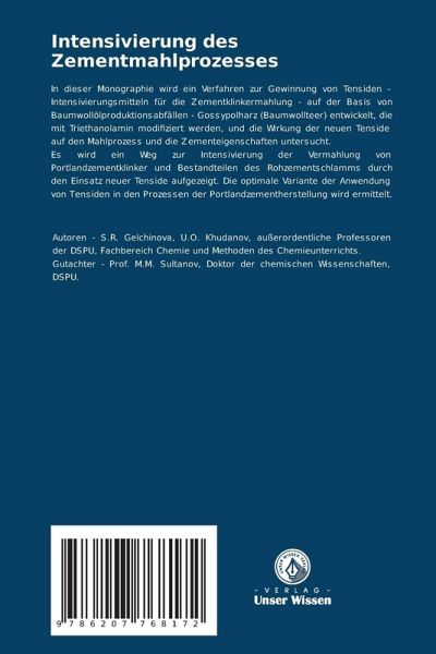 In dieser Monographie wird ein Verfahren zur Gewinnung von Tensiden - Intensivierungsmitteln für die Zementklinkermahlung - auf der Basis von Baumwollölproduktionsabfällen - Gossypolharz (Baumwollteer) entwickelt, die mit Triethanolamin modifiziert werden, und die Wirkung der neuen Tenside auf den Mahlprozess und die Zementeigenschaften untersucht.Es wird ein Weg zur Intensivierung der Vermahlung von Portlandzementklinker und Bestandteilen des Rohzementschlamms durch den Einsatz neuer Tenside aufgezeigt. Die optimale Variante der Anwendung von Tensiden in den Prozessen der Portlandzementherstellung wird ermittelt.