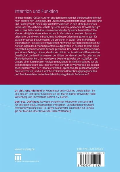 In diesem Band rücken Autoren aus den Bereichen der theoretisch und empirisch orientierten Soziologie, der Erziehungswissenschaft sowie aus Beratung und Politik jeweils eine Frage nach Verhältnissen in den Mittelpunkt ihres Interesses: Wie nehmen soziale Systeme auf ihre personale Umwelt Bezug? Wie ist das Selbstverhältnis sinnverwendender Systeme beschaffen? Wie können alltäglich lebende Menschen ihr Verhalten an sozialen Systemen orientieren, und welche Bedeutung ist diesen Orientierungsleistungen für soziale Prozesse beizumessen? Die zunächst in sozial- und interaktionstheoretischer Perspektive entwickelten Antworten werden exemplarisch für Aufklärungen des Erziehungssystems aufgegriffen, in dessen Kontext diese Fragestellungen besondere Brisanz gewinnen. Über diese Problematisierungen führen Beiträge hinaus, die das Verhältnis der funktional differenzierten Gesellschaft zu den Phänomenen der Eliten, der Gewalt des Terrorismus, der ökologischen Risiken, des Gewissens beziehungsweise der Sozialform der Gruppe einer funktionalen Analyse unterziehen. Schließlich geht es vor diesem Hintergrund um das Theorie-Praxis-Verhältnis: Wie werden die in einer spezifischen Praxis der Theorie erstellten Ergebnisse der gesellschaftlichen Praxis vermittelt, und auf welche praktischen Rezeptionsgepflogenheiten und Anschlusschancen treffen dabei theoriegeleitete Reflexionen?