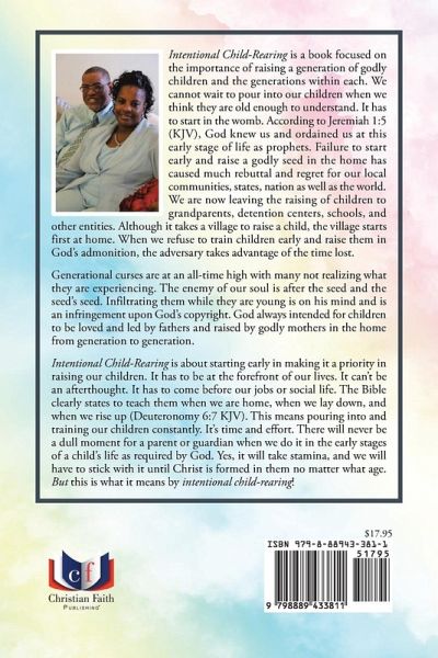 Intentional Child-Rearing is a book focused on the importance of raising a generation of godly children and the generations within each. We cannot wait to pour into our children when we think they are old enough to understand. It has to start in the womb. According to Jeremiah 1:5 (KJV), God knew us and ordained us at this early stage of life as prophets. Failure to start early and raise a godly seed in the home has caused much rebuttal and regret for our local communities, states, nation as well as the world. We are now leaving the raising of children to grandparents, detention centers, schools, and other entities. Although it takes a village to raise a child, the village starts first at home. When we refuse to train children early and raise them in God's admonition, the adversary takes advantage of the time lost. Generational curses are at an all-time high with many not realizing what they are experiencing. The enemy of our soul is after the seed and the seed's seed. Infiltrating them while they are young is on his mind and is an infringement upon God's copyright. God always intended for children to be loved and led by fathers and raised by godly mothers in the home from generation to generation. Intentional Child-Rearing is about starting early in making it a priority in raising our children. It has to be at the forefront of our lives. It can't be an afterthought. It has to come before our jobs or social life. The Bible clearly states to teach them when we are home, when we lay down, and when we rise up (Deuteronomy 6:7 KJV). This means pouring into and training our children constantly. It's time and effort. There will never be a dull moment for a parent or guardian when we do it in the early stages of a child's life as required by God. Yes, it will take stamina, and we will have to stick with it until Christ is formed in them no matter what age. But this is what it means by intentional child-rearing!