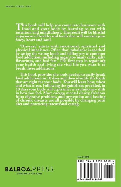 This book will help you come into harmony with food and your body by learning to eat with intention and mindfulness. The result will be blissful enjoyment of healthy real foods that will nourish your body, heart and soul. 'Dis-ease' starts with emotional, spiritual and physical imbalance. Often that imbalance is sparked by eating the wrong foods and falling pry to common food addictions including sugar, too many carbs, salty flavorings, and bad fats. The first step in regaining your health and living the vital life you want is to break these addictions. This book provides the tools needed to easily break food addictions in 10 days and then identify the foods that are right for your body. You will learn how, when and what to eat. Following the guidelines provided, in 10 days your body will experience a revolutionary shift in how you feel. More energy, mental clarity, freedom from digestive problems and prevention and healing of chronic diseases are all possible by changing your diet and practicing intentional eating.