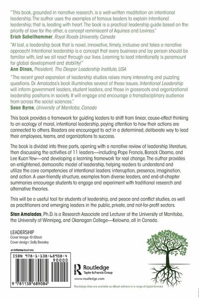This book provides a framework for guiding leaders to shift from linear, cause-effect thinking to an ecology of moral, intentional leadership, paying attention to how their actions are connected to others. Readers are encouraged to act in a determined, deliberate way to lead their employees, teams, and organizations to success. The book is divided into three parts, opening with a narrative review of leadership literature, then discussing the activities of 11 leaders-including Pope Francis, Barack Obama, and Lee Kuan Yew-and developing a learning framework for real change. The author provides an enlightened, democratic model of leadership, helping readers to understand and utilize the core competencies of intentional leaders: interruption, presence, imagination, and action. A user-friendly structure, examples from diverse leaders, and end-of-chapter summaries encourage students to engage and experiment with traditional research and alternative theories. This will be a useful tool for students of leadership, and peace and conflict studies, as well as practitioners and emerging leaders in the public, private, and not-for-profit sectors.