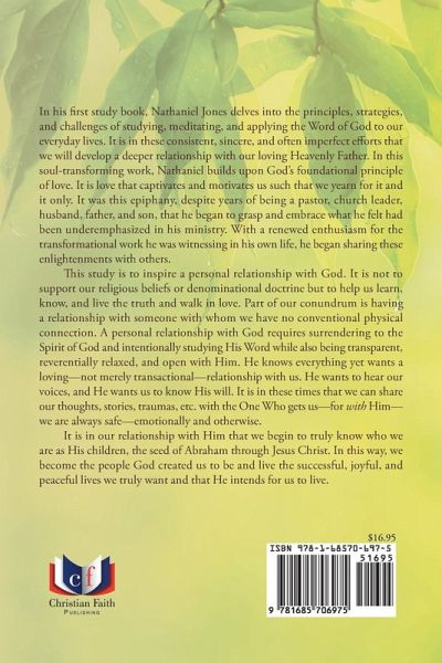 In his first study book, Nathaniel Jones delves into the principles, strategies, and challenges of studying, meditating, and applying the Word of God to our everyday lives. It is in these consistent, sincere, and often imperfect efforts that we will develop a deeper relationship with our loving Heavenly Father. In this soul-transforming work, Nathaniel builds upon God's foundational principle of love. It is love that captivates and motivates us such that we yearn for it and it only. It was this epiphany, despite years of being a pastor, church leader, husband, father, and son, that he began to grasp and embrace what he felt had been underemphasized in his ministry. With a renewed enthusiasm for the transformational work he was witnessing in his own life, he began sharing these enlightenments with others. This study is to inspire a personal relationship with God. It is not to support our religious beliefs or denominational doctrine but to help us learn, know, and live the truth and walk in love. Part of our conundrum is having a relationship with someone with whom we have no conventional physical connection. A personal relationship with God requires surrendering to the Spirit of God and intentionally studying His Word while also being transparent, reverentially relaxed, and open with Him. He knows everything yet wants a loving--not merely transactional--relationship with us. He wants to hear our voices, and He wants us to know His will. It is in these times that we can share our thoughts, stories, traumas, etc. with the One Who gets us--for with Him--we are always safe--emotionally and otherwise. It is in our relationship with Him that we begin to truly know who we are as His children, the seed of Abraham through Jesus Christ. In this way, we become the people God created us to be and live the successful, joyful, and peaceful lives we truly want and that He intends for us to live.