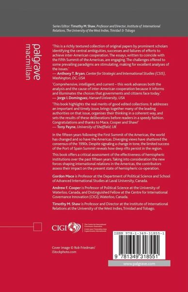 'This is a richly textured collection of original papers by prominent scholars identifying the central ambiguities, successes and failures of efforts to achieve inter-American cooperation. The essays, written to coincide with the Fifth Summit of the Americas, are engaging. The challenges offered to some prevailing paradigms are stimulating, making for excellent analyses of the issues.' Anthony T. Bryan, Center for Strategic and International Studies (CSIS), Washington, DC, USA