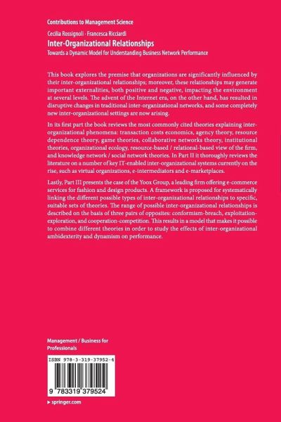 Lastly, Part III presents the case of the Yoox Group, a leading firm offering e-commerce services for fashion and design products. A framework is proposed for systematically linking the different possible types of inter-organizational relationships to specific, suitable sets of theories. The range of possible inter-organizational relationships is described on the basis of three pairs of opposites: conformism-breach, exploitation-exploration, and cooperation-competition. This results in a model that makes it possible to combine different theories in order to study the effects of inter-organizational ambidexterity and dynamism on performance.