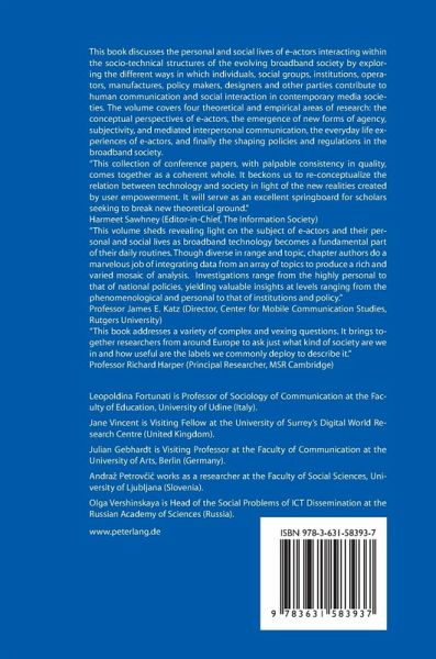 Contents: Leopoldina Fortunati/Jane Vincent/Julian Gebhardt/Andraz Petrovcic/Olga Vershinskaya: Introduction: Approaching the notion of humans as e-actors interacting with Broadband Society - Leopoldina Fortunati: From ICT User to Broadband e-Actor - Gregor Petric/Andraz Petrovcic/Vasja Vehovar: Communication Technology Use as a Structuration Process: Exploring the Communicative Portraits of Active Users - Hajo Greif/Oana Mitrea/Matthias Werner: Usability vs. Functionality? Mobile Broadband Technologies and User Agency - Giuseppina Pellegrino: Mediated Bodies in saturated environments: Participation as co-construction - Amparo Lasen: Mobile Culture and Subjectivities: an Example of the Shared Agency between People and Technology - Julian Gebhardt: Alfred Schütz and the media: The intersubjective constitution of mediated interpersonal communication in everyday life - Jane Vincent: Me and My Mobile - Vsevolod M. Zherebin: Information Society as the Law-governed Result of the Evolution of Information - Olga Vershinskaya: Theoretical Approach to the Concept of Humans as e-Actors - Lilia Raycheva: Television: The Good, The Bad and the Unexpected Challenges of ICT - Panayiota Tsatsou: Digital Divides in Greece: The Role of Culture and Regulation in Internet Adoption. Implications for the European Information Society - Vesna Dolnicar: Regulating on an informed basis: Integrative methodological framework for monitoring the digital divide.
