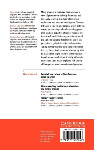 Many scholars of language have accepted a view of grammar as a clearly delineated and internally coherent structure which is best understood as a self-contained system. The contributors to this volume propose a very different way of approaching and understanding grammar, taking it as part of a broader range of systems which underlie the organisation of social life and emphasising its role in the use of language in everyday interaction and cognition. Taking as their starting-point the position that the very integrity of grammar is bound up with its place in the larger schemes of the organisation of human conduct, particularly with social interaction, their essays explore a rich variety of linkages between interaction and grammar.