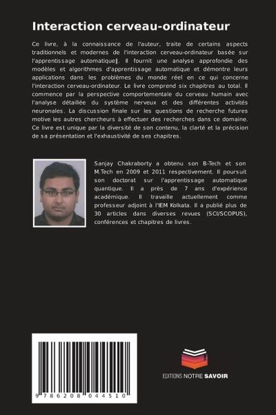 Ce livre, à la connaissance de l'auteur, traite de certains aspects traditionnels et modernes de l'interaction cerveau-ordinateur basée sur l'apprentissage automatique . Il fournit une analyse approfondie des modèles et algorithmes d'apprentissage automatique et démontre leurs applications dans les problèmes du monde réel en ce qui concerne l'interaction cerveau-ordinateur. Le livre comprend six chapitres au total. Il commence par la perspective comportementale du cerveau humain avec l'analyse détaillée du système nerveux et des différentes activités neuronales. La discussion finale sur les questions de recherche futures motive les autres chercheurs à effectuer des recherches dans ce domaine. Ce livre est unique par la diversité de son contenu, la clarté et la précision de sa présentation et l'exhaustivité de ses chapitres.