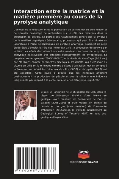 L'objectif de la rédaction et de la publication de ce livre est de sensibiliser et de stimuler davantage de recherches sur le rôle des minéraux dans la production de pétrole. Le pétrole est naturellement généré par la pyrolyse de la matière organique sédimentaire, processus qui peut être simulé en laboratoire à l'aide de techniques de pyrolyse analytique. L'objectif de cette étude était d'étudier le rôle des minéraux dans la production de pétrole par le biais des effets des interactions entre minéraux au cours de la pyrolyse analytique et d'évaluer s'ils affectent qualitativement les pyroproduits. La température de pyrolyse (750°C-1000°C) et la durée de chauffage (8-15 sec) ont été fixées comme paramètres cinétiques. L'asphalte, qui a été isolé du bitume en utilisant le n-hexane comme solvant d'extraction, est un composé intéressant sur lequel les minéraux de silice (SiO2) et de pyrite (FeS2) ont été adsorbés. Cette étude a prouvé que les minéraux affectent qualitativement la production de pétrole et que la silice a une influence insignifiante par rapport à la pyrite qui a un effet catalytique significatif.