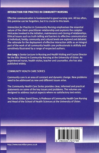 This exciting book covers a range of models and approaches to advanced communication within the context of contemporary community health care nursing. Theoretical definitions of communication will be given and the intricacies involved in initiating, maintaining and closing a therapeutic relationship are examined. The essential skills for health-giving communication, relating to information giving, health promotion, counselling and the therapeutic use of the self, are highlighted. Barriers to effective communication will be discussed, together with practical suggestions for overcoming these barriers.