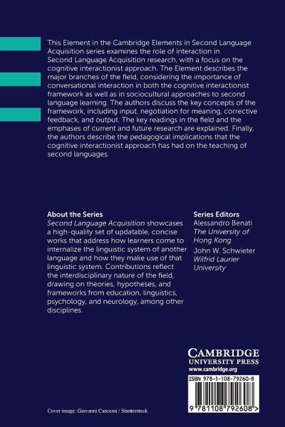 This Element examines the role of interaction in Second Language Acquisition research, with a focus on the cognitive interactionist approach. It describes major branches of the field, considering the importance of conversational interaction in the cognitive interactionist framework as well as sociocultural approaches to second language learning.