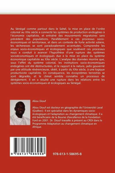 Au Sénégal comme partout dans le Sahel, la mise en place de l'ordre colonial au XXe siècle a connecté les systèmes de production endogènes à l'économie capitaliste, et entraîné des mouvements migratoires sans précédent des populations. Parallèlement à ces processus socio-économiques et territoriaux, et dans un contexte de forte activité solaire, les sécheresses se sont paradoxalement accentuées. Comprendre les enjeux socio-économiques et écologiques que soulèvent ces processus nous a conduit à avancer l'hypothèse d'une rupture des systèmes socioéconomiques et écologiques due à la mise en place du système économique capitaliste au XXe siècle. L'analyse des données montre que, sous l'effet du système colonial, les institutions socio-économiques endogènes ont été déstructurées, et le rapport à la nature, jadis gouverné par une attitude révérencieuse, obéit, à partir du XXe siècle, à une logique productiviste capitaliste. En conséquence, les écosystèmes terrestres se sont dégradés, et le climat semble connaître un processus de dérèglement. Il en a résulté une rupture dans les relations entre les systèmes socio-économiques et écologiques au Sénégal.