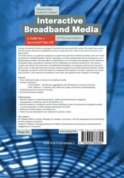 This book serves as a guide for companies to explore the path from traditional media to the new world of interactive broadband media. The key challenge is to base indispensable future investments on reliable business models. This book offers a comprehensive set of concepts and strategies for the interactive broadband realm, grounded in attractive service offerings and customer preferences. The authors explain and analyze the interaction of broadband technologies, its processes and the end customers' point of view. At the same time they provide current examples of successful long-term business models. By applying Accenture's tried and tested Get Audience / Sell Audience concept, companies can assess their position in the interactive broadband value chain and optimize their strategies accordingly.