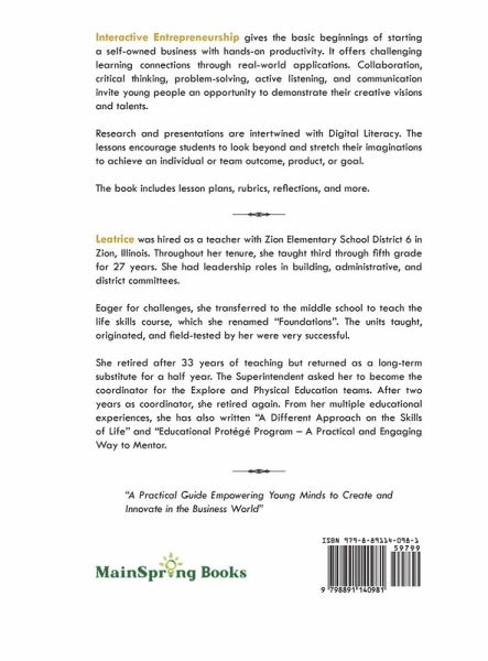 Interactive Entrepreneurship gives the basic beginnings of starting a self-owned business with hands-on productivity. It offers challenging learning connections through real-world applications. Collaboration, critical thinking, problem-solving, active listening, and communication invite young people an opportunity to demonstrate their creative visions and talents.Research and presentations are intertwined with Digital Literacy. The lessons encourage students to look beyond and stretch their imaginations to achieve an individual or team outcome, product, or goal. The book includes lesson plans, rubrics, reflections, and more.