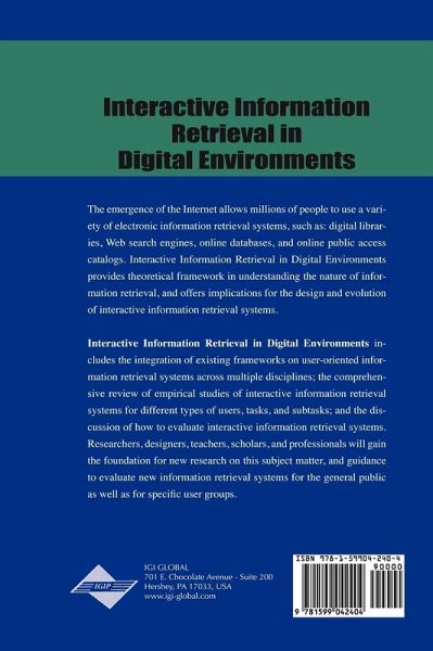 The emergence of the Internet allows millions of people to use a variety of electronic information retrieval systems, such as: digital libraries, Web search engines, online databases, and online public access catalogs. Interactive Information Retrieval in Digital Environments provides theoretical framework in understanding the nature of information retrieval, and offers implications for the design and evolution of interactive information retrieval systems. Interactive Information Retrieval in Digital Environments includes the integration of existing frameworks on user-oriented information retrieval systems across multiple disciplines; the comprehensive review of empirical studies of interactive information retrieval systems for different types of users, tasks, and subtasks; and the discussion of how to evaluate interactive information retrieval systems. Researchers, designers, teachers, scholars, and professionals will gain the foundation for new research on this subject matter, and guidance to evaluate new information retrieval systems for the general public as well as for specific user groups.