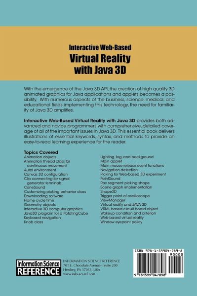 With the emergence of the Java 3D API, the creation of high quality 3D animated graphics for Java applications and applets becomes a possibility. With numerous aspects of the business, science, medical, and educational fields implementing this technology, the need for familiarity of Java 3D amplifies. Interactive Web-Based Virtual Reality with Java 3D provides both advanced and novice programmers with comprehensive, detailed coverage of all of the important issues in Java 3D. This essential book delivers illustrations of essential keywords, syntax, and methods to provide an easy-to-read learning experience for the reader.