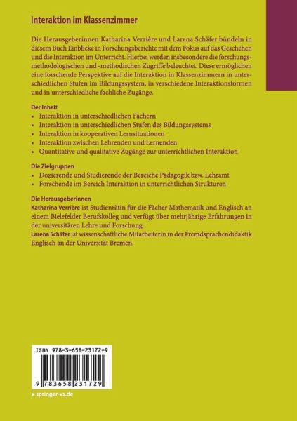 Interaktion in unterschiedlichen Fächern.- Interaktion in unterschiedlichen Stufen des Bildungssystems.- Interaktion in kooperativen Lernsituationen.- Interaktion zwischen Lehrenden und Lernenden.- Quantitative und qualitative Zugänge zur unterrichtlichen Interaktion.