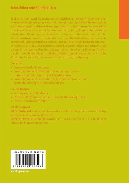 In diesem Band wird die in der wissenschaftlichen Debatte bislang wenig beachtete Wechselbeziehung zwischen Interaktions- und Koordinationsarbeit am Beispiel sozialer Dienstleistungen beleuchtet: Koordinationsarbeit bildet beispielsweise eine wesentliche Voraussetzung für gelungene Interaktionsarbeit; Koordinationsarbeit beinhaltet selbst auch Interaktionsarbeit. Der Zusammenhang zwischen Interaktions- und Koordinationsarbeit wird in theoretisch-konzeptioneller Hinsicht und auf Basis empirischer Befunde aus verschiedenen Handlungsfeldern sozialer Dienstleistungen hin entfaltet. Auf dieser Grundlage werden Gestaltungsansätze für eine nachhaltige Arbeitsqualität von Interaktions- und Koordinationsarbeit sowie ein erweitertes Produktivitätsverständnis sozialer Dienstleistungen aufgezeigt.