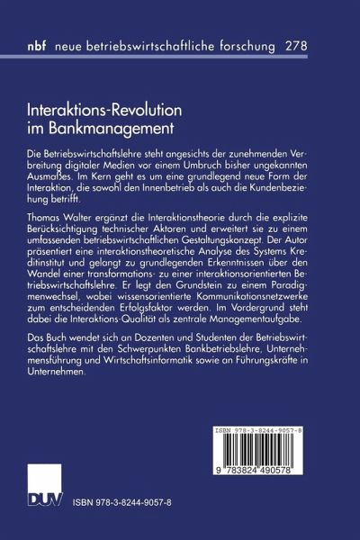 Thomas Walter ergänzt die Interaktionstheorie durch die explizite Berücksichtigung technischer Aktoren und erweitert sie zu einem umfassenden betriebswirtschaftlichen Gestaltungskonzept. Der Autor präsentiert eine interaktionstheoretische Analyse des Systems Kreditinstitut und gelangt zu grundlegenden Erkenntnissen über den Wandel einer transformations- zu einer interaktionsorientierten Betriebswirtschaftslehre. Er legt den Grundstein zu einem Paradigmenwechsel, wobei wissensorientierte Kommunikationsnetzwerke zum entscheidenden Erfolgsfaktor werden. Im Vordergrund steht dabei die Interaktions-Qualität als zentrale Managementaufgabe.