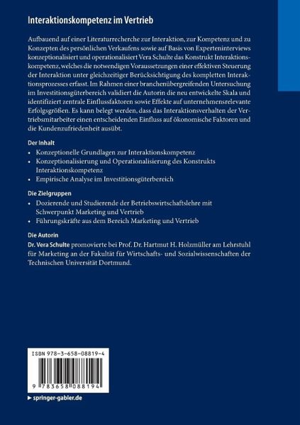 Aufbauend auf einer Literaturrecherche zur Interaktion, zur Kompetenz und zu Konzepten des persönlichen Verkaufens sowie auf Basis von Experteninterviews konzeptionalisiert und operationalisiert Vera Schulte das Konstrukt Interaktionskompetenz, welches die notwendigen Voraussetzungen einer effektiven Steuerung der Interaktion unter gleichzeitiger Berücksichtigung des kompletten Interaktionsprozesses erfasst. Im Rahmen einer branchenübergreifenden Untersuchung im Investitionsgüterbereich validiert die Autorin die neu entwickelte Skala und identifiziert zentrale Einflussfaktoren sowie Effekte auf unternehmensrelevante Erfolgsgrößen. Es kann belegt werden, dass das Interaktionsverhalten der Vertriebsmitarbeiter einen entscheidenden Einfluss auf ökonomische Faktoren und die Kundenzufriedenheit ausübt.
