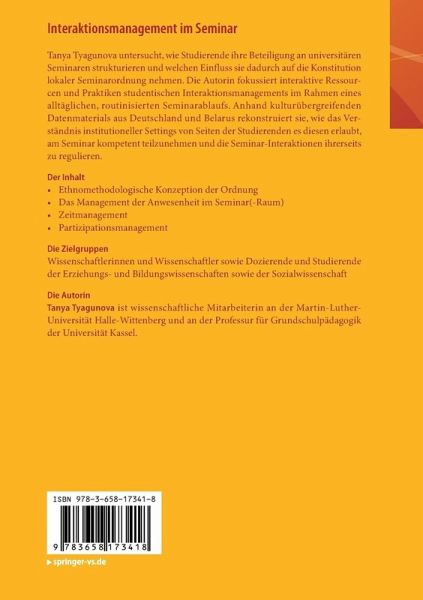 Tanya Tyagunova untersucht, wie Studierende ihre Beteiligung an universitären Seminaren strukturieren und welchen Einfluss sie dadurch auf die Konstitution lokaler Seminarordnung nehmen. Die Autorin fokussiert interaktive Ressourcen und Praktiken studentischen Interaktionsmanagements im Rahmen eines alltäglichen, routinisierten Seminarablaufs. Anhand kulturübergreifenden Datenmaterials aus Deutschland und Belarus rekonstruiert sie, wie das Verständnis institutioneller Settings von Seiten der Studierenden es diesen erlaubt, am Seminar kompetent teilzunehmen und die Seminar-Interaktionen ihrerseits zu regulieren.